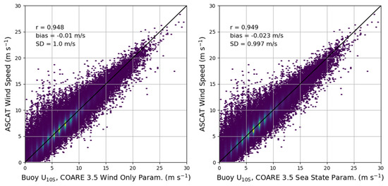 Figure 2 shows scatterplots of ASCAT winds versus buoy derived from the COARE 3.5 model using both the “wind speed only” form of (Figure 2, left) and the parameterization based upon sea state conditions (Figure 2, right).
