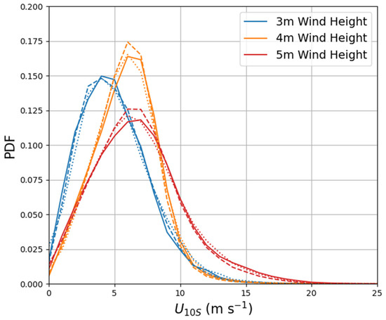 PDFs of buoy (solid) and corresponding ERA5 FG (dashed) and ASCAT winds (dotted) organized by buoy anemometer height bins centered about the height shown in the legend with ±0.5 m.
