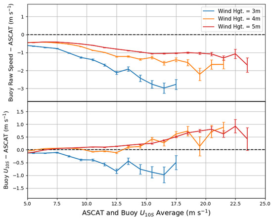 Bin averages of wind speed residuals (buoy—ASCAT) of raw buoy winds and buoy compared with ASCAT wind ranges. Note the difference in the vertical axis of the top pane versus the bottom. Wind speed residuals are grouped by 3-, 4-, and 5-m anemometer heights. Error bars represent ±1 standard error.