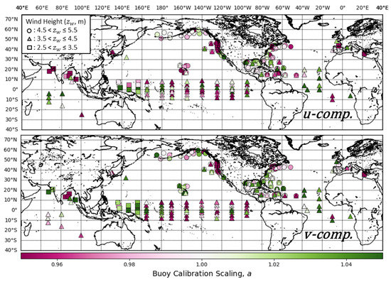 Triple collocation calibration scalings (a) of buoy components calibrated with ASCAT winds as the standard for wind-wave-dominated seas () at the individual buoy level. The top subplot shows the calibration scalings for the u-component () and the bottom is the v-component scalings (). Point shapes correspond to the buoy anemometer height ranges shown in the legend.