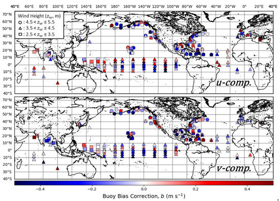 It is important to note that sampling and the appropriateness of the TC error model determines the accuracy of the result [41], and individual buoy calibrations are subject to conditions local to the respective buoy area. The ERA5 variability and variability deficit depend on local conditions, particularly near the equator where both the root-mean-square deviation and bias change sharply with latitude [42]. The inter-tropical convergence zone moves over a year and hence the speeds, variability conditions, and errors at most tropical buoy locations change systematically over the year. This may violate the assumption of constant bias and random error as a function of speed. Most of the buoys in the 3.5–4.5 m anemometer height range are located in the trades and have a rather narrow dynamic range, which makes the results on the error estimates rather uncertain as distinction between and values is poor. This is important to consider with the given distribution of and values shown in Figure 5 and Figure 6. With the given caveats in the TC methodology, we did not observe any strong trends between the anemometer height ranges and the calibration components from Figure 5 and Figure 6 alone, but rather differences due to possible geophysical affects for specific areas.