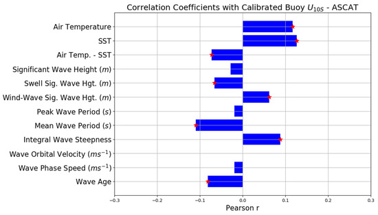 Correlation coefficients of calibrated wind residuals (buoy –ASCAT) with sea state parameters. Red stars indicate statistical significance at the 99% level.