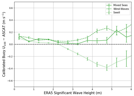 Bin averages of calibrated wind speed residuals (calibrated buoy –ASCAT) compared with ERA5 significant wave height ranges for wind seas (dashed lines), mixed seas (solid lines), and swell dominant seas (dotted lines). Error bars represent ±1 standard error.
