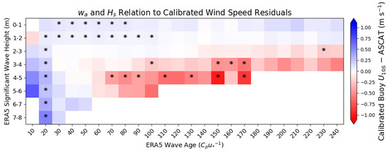 Heat map of the difference between the binned average of calibrated wind speed residuals (calibrated buoy U10SC–ASCAT) for ASCAT wind and ERA5 ranges for buoy residuals at 5 m minus the binned residuals at 4 m anemometer height in wind-wave-dominated seas (). Bold values with an asterisk (∗) indicate statistically significant differences between the residuals at separate anemometer heights defined using Welch’s t-test with a p-value limit of 0.05.