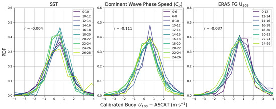 Probability density functions of wind speed residuals (calibrated buoy –ASCAT) binned by ERA5 between 4 and 6 m and SST (left), (center), and ERA FG (right) ranges colored by value bins in the figure legends. The Pearson correlation coefficient (r) between wind speed residuals and the variable in question is shown in the top left of each plot.