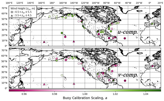 Several geophysical effects may lead to differences between buoy and ASCAT winds. Large wind variability in the extratropics and the effects of currents in the tropics are shown to affect buoy wind comparisons [16]. To isolate the error sources more effectively to the individual buoys and their locations, we performed TC at the individual level. Figure 5 shows the calibration scalings () for the buoy wind components calibrated using ASCAT as the reference winds. The calibration scalings were used in conjunction with the bias correction terms (, Figure 6) to linearly correct buoy towards ASCAT. The biases were simply the average differences between the datasets (Equation (11)). The combination of the scaling () and the offset () can be used to determine ranges over which an instrument overestimates or underestimates relative to one of the other datasets (Equation (12)). These were exactly analogous to changes in a line due to a regression of the slope and y-intercept. The key difference in concept is accounting for similarity in the sub-gridscale variability in two of the datasets relative to another when determining the slope (Equations (8)–(10)).