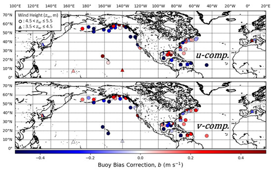Triple collocation calibration bias corrections (b) of buoy components calibrated with ASCAT winds as the standard for the full range of winds at the individual buoy level. The top subplot shows the calibration bias corrections for the u-component () and the bottom is the v-component bias corrections (). Point shapes correspond to the buoy anemometer height ranges shown in the legend.