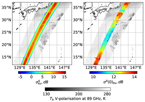 In Figure 1, the example of raw and processed DPR data is presented for the case of typhoon Hagibis. Onboard GPM satellite multichannel microwave radiometer (GPM Microwave Imager—GMI) is installed. In the background, the image of brightness temperature from GMI data at 89 GHz, V-polarization shows the position of the typhoon. Raw data of Ku-band radar is presented in the left figure and retrieved NRCS at nadir is in the right. Closer to the typhoon center NRCS at nadir decreases due to sea surface roughness increase.
