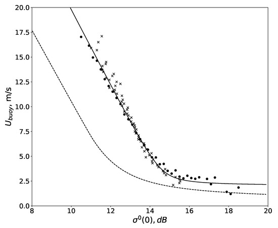 The function satisfies the following requirements: it tends to a positive constant at high NRCS, has a tilted asymptote at low NRCS, the function itself and its first derivative are continuous, and its second derivative is always positive. The coefficients for Ku-band dependence are as follows: , , , . The model is valid for NRCS within 10 and 20 dB. The regression dependence for binned data is presented in Figure 4 with a solid line, and the dependence from [7] is presented with a dashed line for comparison. The model in [7] was obtained using ENVISAT (Environmental Satellite) radar altimeter data, and the discrepancy between the models is due to different calibration of the radars.