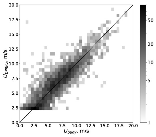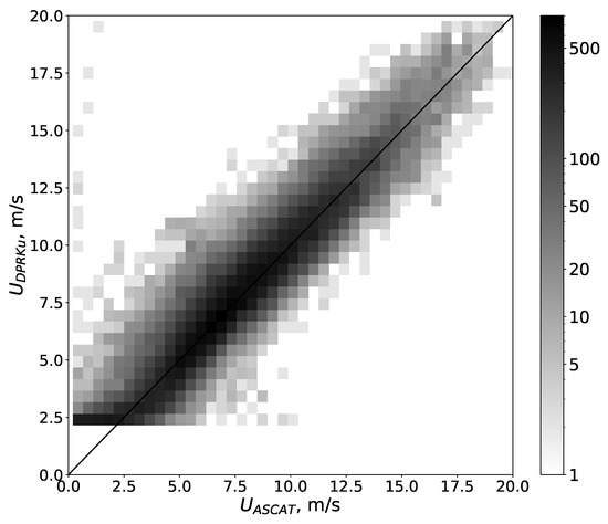 Furthermore, the ASCAT-A scatterometer data was used for validation. The collocated array of ASCAT and Ku-band DPR data was formed for January 2017. Collocation length was 25 km and time was not higher than 15 min. The total array contains 57,213 pairs . The scatter plot is presented in Figure 7. Overall bias and standard deviation of differende (SDD) were 0.28 and 1.26 m/s respectively, correlation coefficient was 0.93.