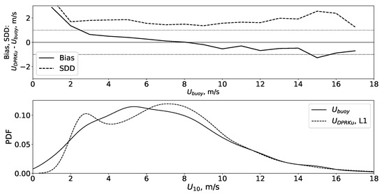 Wind speed difference (bias) and standard deviation of the difference (SDD) between DPR Ku-band radar and NDBC buoys (top). Wind speed PDF for DPR and buoy data of L1 array (bottom).