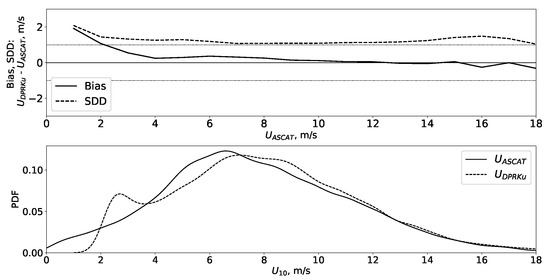 Figure 8 (top) shows the variations of bias and SDD between DPR and ASCAT wind speed with respect to wind speed values. The results of DPR are very close to ASCAT data: the binned bias is limited to 1 m/s and SDD tends to 1 m/s.
