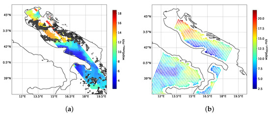 (a) Wind speed in the Adriatic sea on 17 January 2017, 06:20 UTC, according to Ku-band DPR data (color), rain contaminates cells with rain rate over 0.5 mm/h (black); (b) wind speed in the Adriatic sea on 17 January 2017, 08:50 UTC, according to ASCAT data.