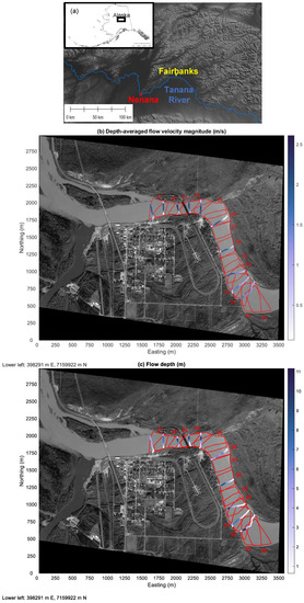 Information on streamflow and hydraulic characteristics in rivers is essential to a range of applications in water resource management. For example, such data are crucial for monitoring water supply, maintaining infrastructure, assessing flood hazards, and characterizing aquatic habitat. However, measuring velocity, depth, and discharge via conventional field methods can be difficult, dangerous, and expensive, particularly in remote areas with limited access. In the U.S., this problem is most acute in Alaska, where the state’s 1,200,000 km of rivers and streams are currently monitored by only 111 continuously operating stream gages; the density of this observational network is far less than that of the contiguous U.S. [1]. A primary reason so many of Alaska’s rivers remain ungaged is the logistical challenge of making periodic streamflow measurements and maintaining gages. Collecting more detailed, spatially distributed data on flow velocities and depths within a reach represents an even more daunting task and would pose additional risk to field personnel. Moreover, because many of the existing gages are located in roadless areas, hydrographers often must be transported to these sites by helicopter. To address these issues, the U.S. Geological Survey (USGS) is actively pursuing non-contact methods of estimating streamflow from various platforms. The motivation for these ongoing efforts is to improve safety, increase efficiency, and expand the monitoring network. Remotely sensed data sets and approaches employed for this purpose include (1) images acquired from satellites and analyzed based on various hydraulic approximations [2,3,4]; and (2) near-field techniques that include data collected from bridges [5,6], small unmanned aircraft systems (UAS, or drones) [7,8,9], helicopters [10], and fixed-wing aircraft [11]. In this study, we build upon previous work on remote sensing of flow velocities by introducing a new method for also inferring water depths.