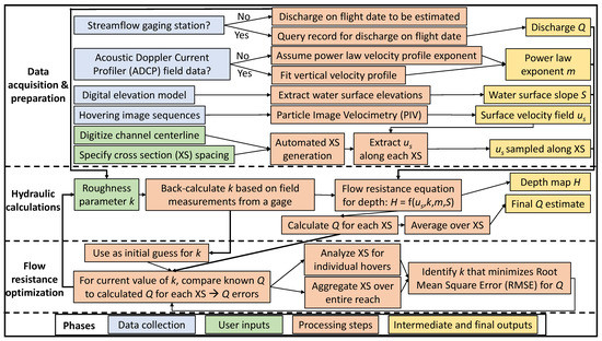 Conceptual diagram outlining the data, user inputs, processing steps, and outputs of the DIVERS workflow for inferring water depths from remotely sensed surface flow velocities.