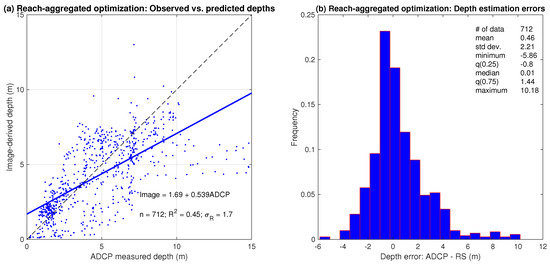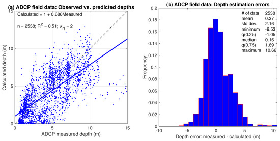 Accuracy assessment of depths estimated from ADCP measurements of depth-averaged flow velocity for the entire reach: (a) Observed (measured in the field with an ADCP) vs. predicted (estimated from ADCP measurements of depth-averaged velocity using a flow resistance equation) regression output. (b) Distribution of depth estimation errors, defined as ADCP measurements minus estimates from flow resistance equation.