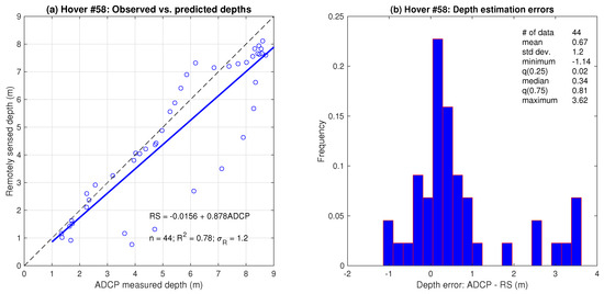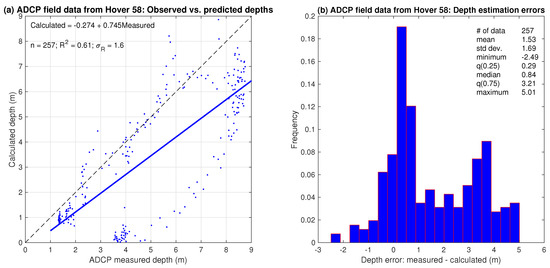 Accuracy assessment of depths estimated from ADCP measurements of depth-averaged flow velocity for a single cross section located within Hover 58: (a) Observed (measured in the field with an ADCP) vs. predicted (estimated from ADCP measurements of depth-averaged velocity using a flow resistance equation) regression output. (b) Distribution of depth estimation errors, defined as ADCP measurements minus estimates from flow resistance equation.