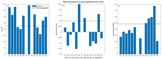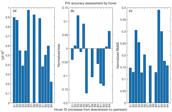 Accuracy assessment of particle image velocimetry (PIV)-derived surface flow velocity estimates by hover. Metrics of performance include (a) observed (measured in the field with an ADCP) vs. predicted (inferred from PIV) regression ; (b) Normalized bias of velocity estimation errors, with errors defined as ADCP-measured minus remotely sensed; and (c) normalized root mean square error (RMSE) of velocity estimation errors. Bias and RMSE are normalized by the reach-averaged mean of the velocity measurements used for accuracy assessment.