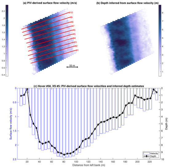 Example output from Hover 58: (a) PIV-derived surface flow velocities extracted along 10 regularly spaced, channel-spanning cross sections. (b) Depths inferred by optimizing the flow resistance coefficient k to match the known discharge. (c) Surface velocities and depths extracted along an example cross section (#5 in (a)).