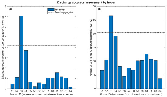 Given these limitations, understanding the relative merits of the two different versions of the DIVERS framework we examined took on added significance as a means of assessing which implementation might provide the most reliable output in a particular situation. The agreement between the discharge measured at the gage and that estimated using the per-hover FRO approach was stronger than for the discharge estimated using the reach-aggregated version of DIVERS. On a per-hover basis, FRO successfully matched the measured discharge to within 1% for 6 of the 14 hovers, with a median value of 1.04%. The smallest errors coincided with the areas where Figure 5 showed that the PIV-derived velocity estimates were most accurate (hovers 51, 56, and 58). Conversely, sub-reaches with less reliable velocity estimates also had larger discharge errors (hovers 53 and 54).