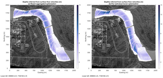 The motivation for exploring the reach-aggregated approach was to produce a continuous, smoothly varying depth map encompassing the entire study area. Figure 15a suggests that the technique was successful in this regard. This map was assembled as a mosaic of the bathymetries inferred for the individual hovers using the globally optimized value of k and captures along- and across-channel variations in depth without noticeable discontinuities between hovers. In contrast, when the depth maps produced for the individual hovers based on k values estimated by applying the FRO algorithm on a per-hover basis were compiled in this manner, pronounced seams were evident, most notably between hovers 62 and 63 at the upstream end of the reach (Figure 15b). These results imply that although depths inferred via the reach-aggregated approach might have been less reliable on a point-by-point basis, the reach-scale output was more internally consistent than when the analysis was performed on a per-hover basis and the output compiled afterward. These findings suggest that a compromise must be reached between local accuracy and larger-scale continuity.