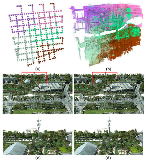 We show the image view clustering result of case “B5 West” with totally 513 images of resolution and in Figure 4a,b, which runs on our server platform with 500 GB memory. We set according to Equation (1). The fused point clouds with and without image view clustering are also given in Figure 4c,d to show the effectiveness of our memory-efficient depth map fusion, which saves the memory cost from 87 GB without clustering, to 28 GB with 5 clusters for the case “B5 West”, but brings almost no difference to the quality of the final fused point cloud, with the point cloud redundancy increased only by of the total fused point cloud size.