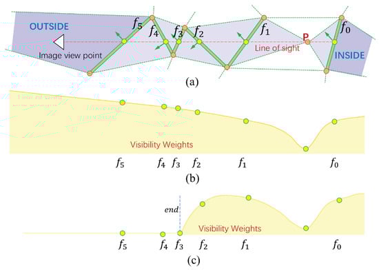 Illustration of our visibility weight strategy: (a) A line of sight from the camera center of an image view traverses a sequence of tetrahedra to a 3D point to accumulate the visibility weighted smooth terms. (b) The visibility weights proposed by [58]. (c) The visibility weights by our strategy, which are stopped by the end facet.