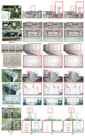 (a) Three representative image views for each case of “B5 Tower” and “ZJU Fan”. (b) The reconstructed surface models of the two cases by [58]. (c) The surface models generated by our meshing approach. (d) Comparisons of the details in the rectangles of (b,c), which shows the effectiveness of our detail-aware surface meshing.