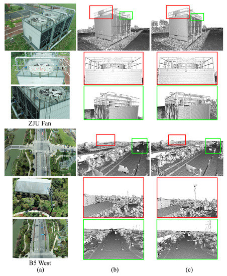 We compare our proposed scheme with SOTA methods including ACMM, OpenMVS [56] and COLMAP [26,55] in four cases “ZJU Fan”, “B5 Tower”, “B5 West” and “B5 Wire” captured by UAV with resolution . For fair comparisons, we use our SfM results as the input to these methods. Thus for COLMAP, we actually only use its MVS module [26]. We perform depth estimation by choosing 8 reference images for the current image, except OpenMVS, for which we use the default setting. The depth map results are given together with their corresponding point clouds by projecting the depth values forward to 3D space to more directly show the 3D geometry of the depth maps. As shown in the highlighted rectangle regions of the depth maps and the point clouds in Figure 3, with the proposed sampling strategy, our depth estimation method performs better than the checkerboard propagation scheme of ACMM and the sequential propagation scheme of OpenMVS and COLMAP in thin structure depth recovery. Additionally, as can be seen in Figure 3, the produced depth maps are more complete and less noisy compared with OpenMVS and COLMAP, which validates the proposed method.