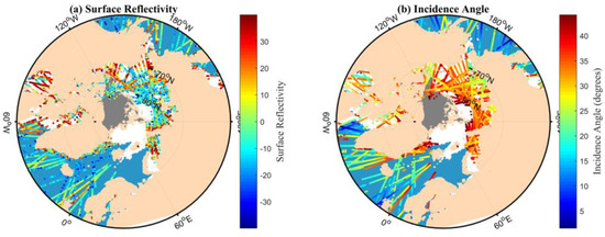 where is the incidence angle over the sea ice, and is the permittivity of sea ice, which is related to sea ice types. In this study, the data with an incidence angle below 45° are applied. Data marked by the quality flags eclipse or direct signal in DDM [51] have also been removed to deal with reliable data. The TDS-1 surface reflectivity and corresponding incidence angle distribution in Arctic regions in 5 days (from 11 to 15 February 2018) is presented in Figure 3.