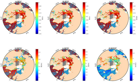 The distribution of (a) RESC (Right Edge Slope of CDW), (b) RESI (Right Edge Slope of IDW), (c) RESD (Right Edge Slope of DDW), (d) REWC (Right Edge Waveform of CDW), (e) REWI (Right Edge Waveform of IDW), and (f) REWD (Right Edge Waveform of DDW) in 5 days (from 11 to 15 February 2018) versus the OSISAF SIT maps. The open water (OW) is described by the light blue color. The white and gray represent the first-year ice (FYI) and multi-year ice (MYI).