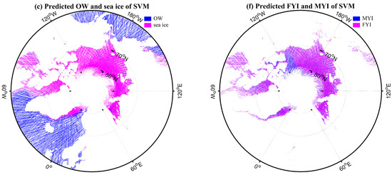 Classification results of random forest (RF) and support vector machine (SVM) classifiers. (a) Reference open water (OW) and sea ice. (b) Predicted OW and sea ice of RF. (c) Predicted OW and sea ice of SVM. (d) Reference first-year ice (FYI) and multi-year ice (MYI). (e) Predicted FYI and MYI of RF. (f) Predicted FYI and MYI of SVM.