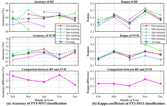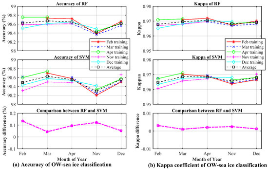 In order to analyze the influence of sea ice growth and melt on sea ice classification and the robustness of the sea ice classification method, another experiment is implemented. Each month of data is used as a training set individually, and the remaining four months of data are used as a test set. The strategy is similar to k-fold cross-validation [62] usually applied in ML. However, the k-fold cross-validation is to split the dataset into k parts randomly, which would eliminate the seasonal effects. Firstly, the data in February are used as the training set, and the data in March, April, November, and December are used as the testing set in turn. Hereafter, the data in Mar, April, November, and December are used as training set successively. The space distribution of classification results is presented in Appendix A (Figure A1, Figure A2, Figure A3, Figure A4, Figure A5, Figure A6, Figure A7, Figure A8, Figure A9 and Figure A10) and Appendix B (Figure A11, Figure A12, Figure A13, Figure A14, Figure A15, Figure A16, Figure A17, Figure A18, Figure A19 and Figure A20). The accuracy and kappa coefficients of OW-sea ice and FYI-MYI classification are shown in Figure 14 and Figure 15, which indicate that the overall accuracy of OW-sea ice changes less than that of FYI-MYI classification. This may be caused by the change of samples distribution as the proportion of OW and sea ice is relatively stable, while that of FYI and MYI changes more easily with ice growth and melt.