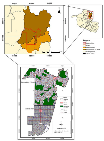 The area used in the study is composed of the settlement projects named Anari and Machadinho. These projects originated in the Vale do Anari and Machadinho do Oeste municipalities, respectively, both located in the northeast of the state of Rondônia (Figure 1). With a total area of 702.48 and 2129.98 km2, respectively, these settlement projects correspond to 22.41% and 25.35% of the area defined by law for the two municipalities in question. The locations are neighbouring municipalities and share the same environmental conditions. They are also both in the tropical climate, are located about 400 km from the capital Porto Velho, and are accessible by road, while river transport can be particularly useful during the rainy season. The dense rainforest is the predominant natural vegetation [29]. Conservation reserves are planned throughout the area and have varying degrees of protection depending on the level of human intervention. The settlement projects under study present different models of occupation, with the fishbone model being implemented in the Anari and the topographic or disorganised multidirectional model in the Machadinho.