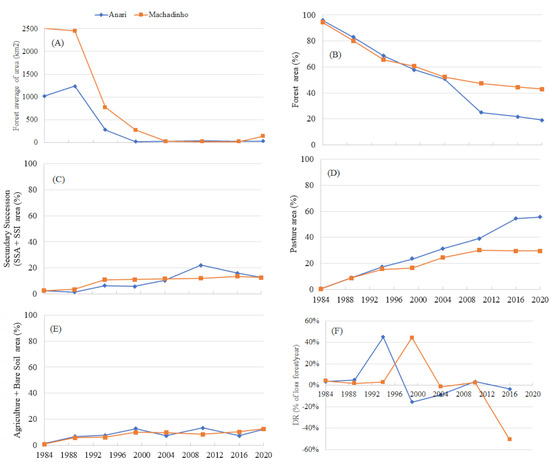 Curve representative of the forest fragmentation (A) as per average of forest area, (B) forest cover and advance of occupation (%) with Secondary Successions (SSA & SSI) (C), pasture (D), bare soil and agricultural (E) areas in the settlements of Machadinho and Anari (1984 to 2020) and Deforestation rate (% of loss forest/year) (F).