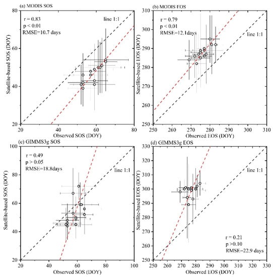 Validations of the (a) SOS and (b) EOS that were derived from the 250 m MODIS NDVI and the (c) SOS and (d) EOS that were derived from the GIMMS3g NDVI.