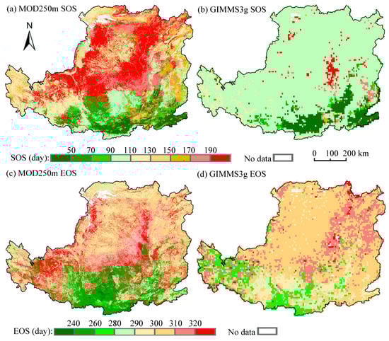 Spatial patterns of the SOSs were estimated from (a) 250 m MODIS and (b) GIMMS3g data from 2001; spatial patterns of the EOSs were estimated from (c) 250 m MODIS and (d) GIMMS3g data from 2001.
