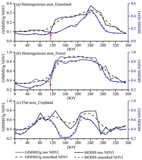 Time series of (a) grassland, (b) forest, and (c) cropland NDVIs from the GIMMS3g and MODIS products.