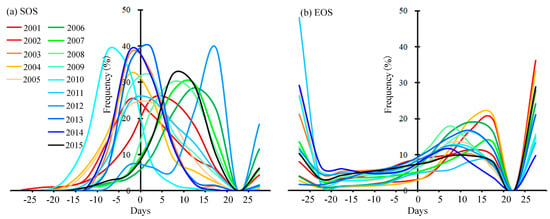 In order to compare the differences between the GIMMS3g-derived and MODIS-derived phenology in flat areas, we calculated the differences of the two datasets in the Weihe Plain during the period 2001–2015 (Figure 5). The findings showed that the differences in SOS (GIMMS3g SOS–250 m MODIS SOS) were mainly less than 5 days and 10 days in 43.49% and 70.66%. The GIMMS3g data performed well at monitoring SOS over the flat areas. In addition, we found that the frequency with which the differences in SOS were greater than 20 days decreased significantly and became close to 0. In the results showing the SOS differences greater than 25 days, the value of the GIMMS3g SOS was always greater than that of the 250 m MODIS SOS. This shows that GIMMS3g SOS tended to be later than MODIS SOS. However, differences in the EOS (GIMMS3g EOS–250 m MODIS EOS) that were less than 5 days or 10 days were only 13.85% and 29.88%. In addition, for the entire Loess Plateau, the proportion of differences in EOS between the GIMMS3g and 250 m MODIS data that were less than 5 days was still less than 20%. This indicated that the consistency of the GIMMS3g EOS and the MODIS EOS was poor, even in flat areas.