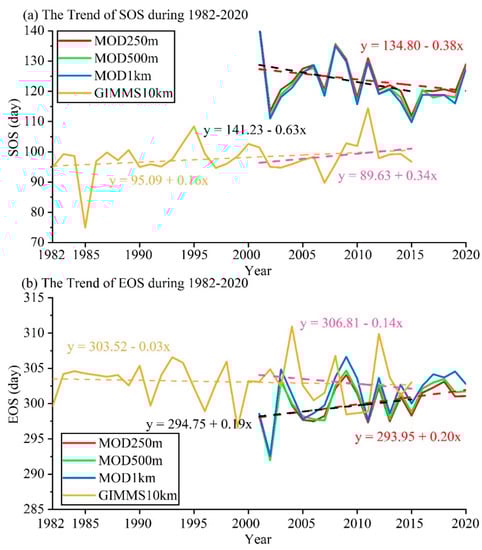 Inter-annual trends of the (a) SOS and (b) EOS that were estimated from the GIMMS3g and MODIS products during the period 1982–2020. The yellow, red, green, and blue solid lines represent the SOS and EOS values that were inferred from the GIMMS3g NDVI (1982–2015) and MODIS NDVI (2001–2020). The yellow dashed line shows the GIMMS3g-based SOS and EOS trends during the period 1982–2015. The pink dashed line shows the GIMMS3g-based SOS and EOS trends during the period 2001–2015. The black and red dashed line shows the 250 m MODIS-based SOS and EOS trends during the periods 2001–2015 and 2001–2020, respectively.