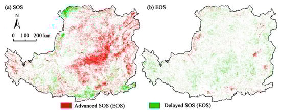 Spatial trends of the (a) SOS and (b) EOS from the 250 m MODIS time-series data during the period 2001–2020.