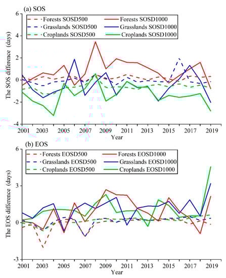 Inter-annual trends of the differences in the (a) SOS and (b) EOS between different land cover types over the Loess Plateau. The dashed line represents the difference in the SOS between the 250 m SOS and 500 m SOS for different land cover types during the period 2001–2019. The solid line represents the difference in SOS between the 250 m SOS and 1000 m SOS in different land cover types during the period 2001–2019.