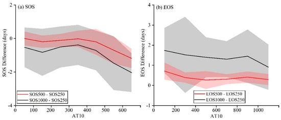 The variation in the differences between multiple sets of the (a) SOS and (b) EOS with an AT10 from January to April and from September to October, respectively. The red line shows the difference between the 500 m MODIS SOS (EOS) and the 250 m MODIS SOS (EOS). The black line shows the difference between the 1000 m MODIS SOS (EOS) and the 250 m MODIS SOS (EOS). The red and gray shadows indicate the standard deviations of the red and black lines, respectively.