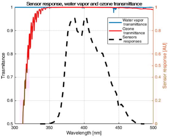 In the case of our prototype, we used the same blue LED studied by [16] for all the measurements, which has a sensor response spectrum between 350 and 450 nm (a typical sensor response can be seen in Figure 2) with an equivalent wavelength near 408 nm. In the same article, it was demonstrated that the absorption spectrum by atmospheric gases can be neglected at regions with no absorption (for example, O and water vapor).