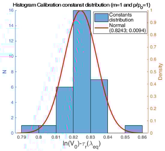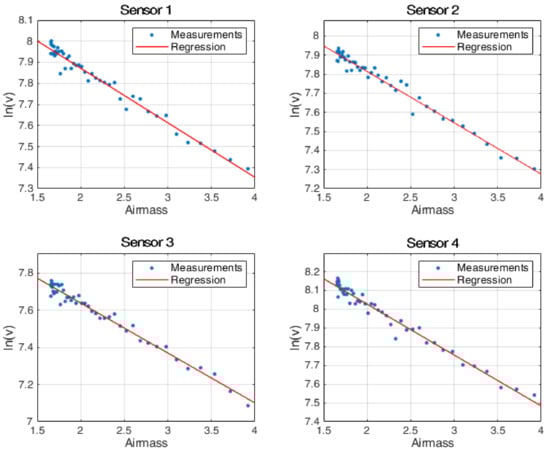 To obtain , the Langley plot extrapolation method [16] is usually used. This method consists of taking several measurements at different sun altitudes with a stable level of aerosols. By using Equation (1), it is possible to obtain Equation (4). If we consider that does not change in all the measurements, we will have a linear equation where the airmass m is the independent variable and the dependent variable. Both variables can be obtained using the instrument and knowing the place and the time of each measurement. Therefore, it is possible to estimate using a linear regression.