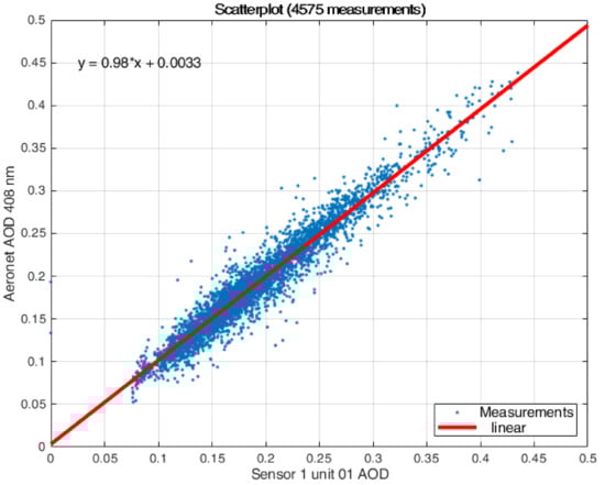 After calibration, it is useful to know the difference between the measurements of our prototypes and the pattern instrument. Figure 4 shows a scatter plot with measurements of one sensor after calibration and the Cimel sun photometer. The details for each sensor are in Table A2 in Appendix A.2. These results show that after the calibration process, the mean difference among the measurements of the Cimel sun photometer and our sensors (4 in an instrument) can be neglected (the mean bias for all the measurements is 0.0002), while the variation is represented as the maximum root mean square error (RMSE) is 0.068, and the maximum mean absolute error (MAE) is 0.026.