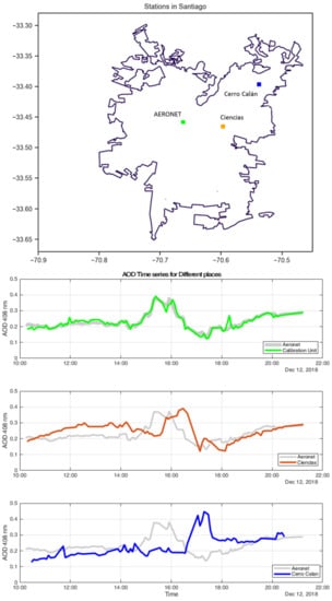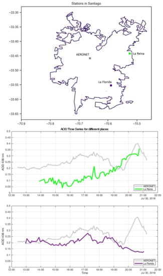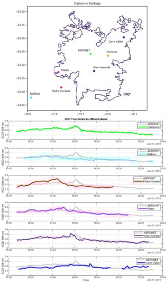 LoCo-ASP was developed and tested in the city of Santiago de Chile (3327S 7040O), where the complex topography induces significant differences in the aerosol daily cycle, even for points located less than 15 km apart [16,17]. This variability was also part of the study motivation, since different aerosol concentrations could introduce inequalities in localized variables, such as solar energy production [31] or human health [32].