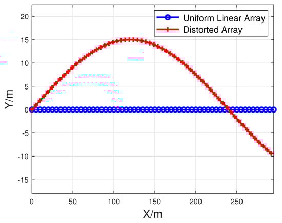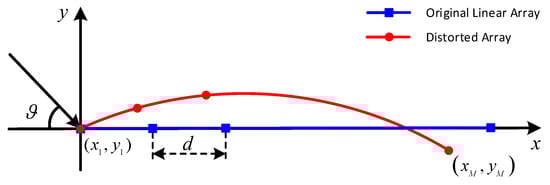 Consider a flexible cable with M omnidirectional hydrophones mounted at a fixed spacing d. Because of oceanic currents, hydrodynamics, and tactical maneuvers of the towing platform, the hydrophone array towed behind a maneuvering platform cannot be kept as a straight line [11], as shown in Figure 1. Suppose that the array shape distortion only occurs on the horizontal plane [40]. Take the position of the hydrophone nearest from the platform as the origin of the coordinate system. The hydrophone in the distorted array is denoted by red circles in Figure 1 as opposed to that in the original linear array denoted by blue squares.
