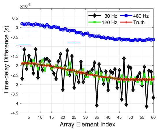 As indicated by (16), for the line-spectrum components with the same SNR, the time-delay difference estimation accuracy is proportional to the frequency of the line-spectrum component. However, for the line-spectrum component with frequency larger than , the absolute value of the actual phase difference may larger than . Thus, the obtained phase difference measurement is ambiguous and wrapped by 2 radians, i.e., and . In the remaining parts of this paper, unless otherwise stated, the line-spectrum component with a frequency larger than is termed high-frequency line-spectrum component, otherwise termed low-frequency line-spectrum component. If one ignores the phase difference ambiguity and still estimates the time-delay difference according to (18) exploiting the wrapped phase difference measurements, the resulted time-delay difference estimation accuracy degrades significantly. Figure 3 shows the time-delay difference estimation results utilizing phase difference measurements from line-spectrum components with frequencies of 30 Hz, 120 Hz, and 480 Hz. It can be noted that, although the time-delay difference estimates obtained from the line-spectrum component with a frequency of 480 Hz have a smaller fluctuation compared to those obtained from the line-spectrum components with frequencies of 30 Hz and 120 Hz, they exhibit significant deviations from the actual values.