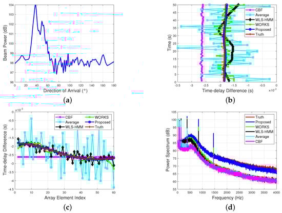 Performance comparisons. (a) Beam power pattern based on the hypothetical uniform linear array. (b) The estimates of the time-delay difference between the first two hydrophones for 50 frames of observation. (c) The estimates for inter-hydrophone time-delay difference of the distorted towed array at the 17th observation. (d) The average for the power spectrum of the enhanced signal in 50 frames of observation.